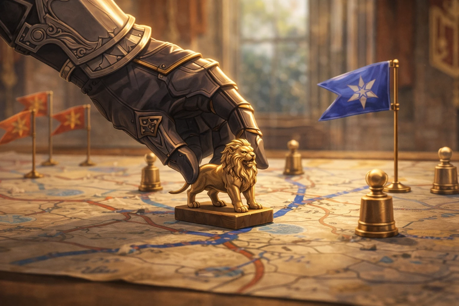 I shifted a carved lion marker closer to the blue supply route—one small movement that told everyone the same thing: