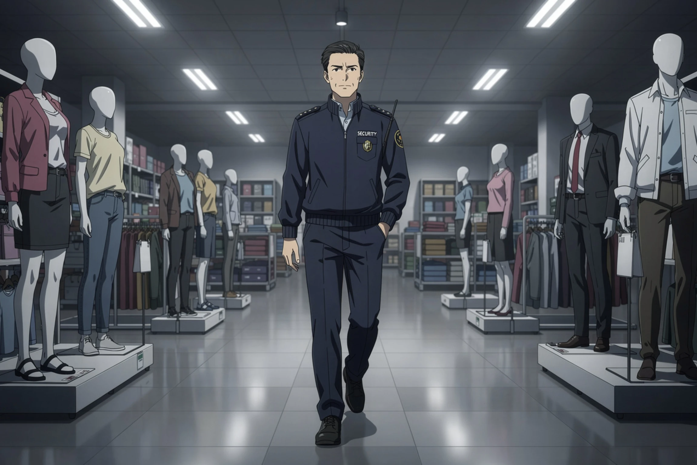 The hours passed in the quiet way night hours do, without edges. He walked. He paused. He doubled back through sections that never changed. He looked into fitting rooms and behind counters and through the front windows at the empty world beyond the glass. The store continued to hum around him, patient and indifferent.