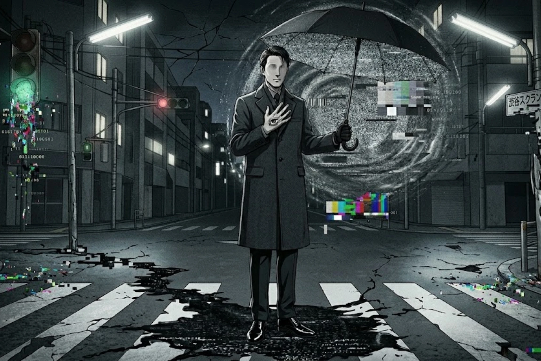 Smaller at that distance, but unmistakable. Still. Centered. Umbrella above him now, open and full of turning interference. The streetlights around him glitched in uneven rings, some dimming, some brightening, some holding at half-strength as though waiting for a decision. The black reflection beneath his feet had spread into the crosswalk, not like water, but like the road itself had forgotten how to remain solid. His shadow, if it was a shadow, climbed the side of a nearby building in broken static bands. Cars at the far end of the avenue slowed without quite stopping. A traffic signal changed and held red too long.