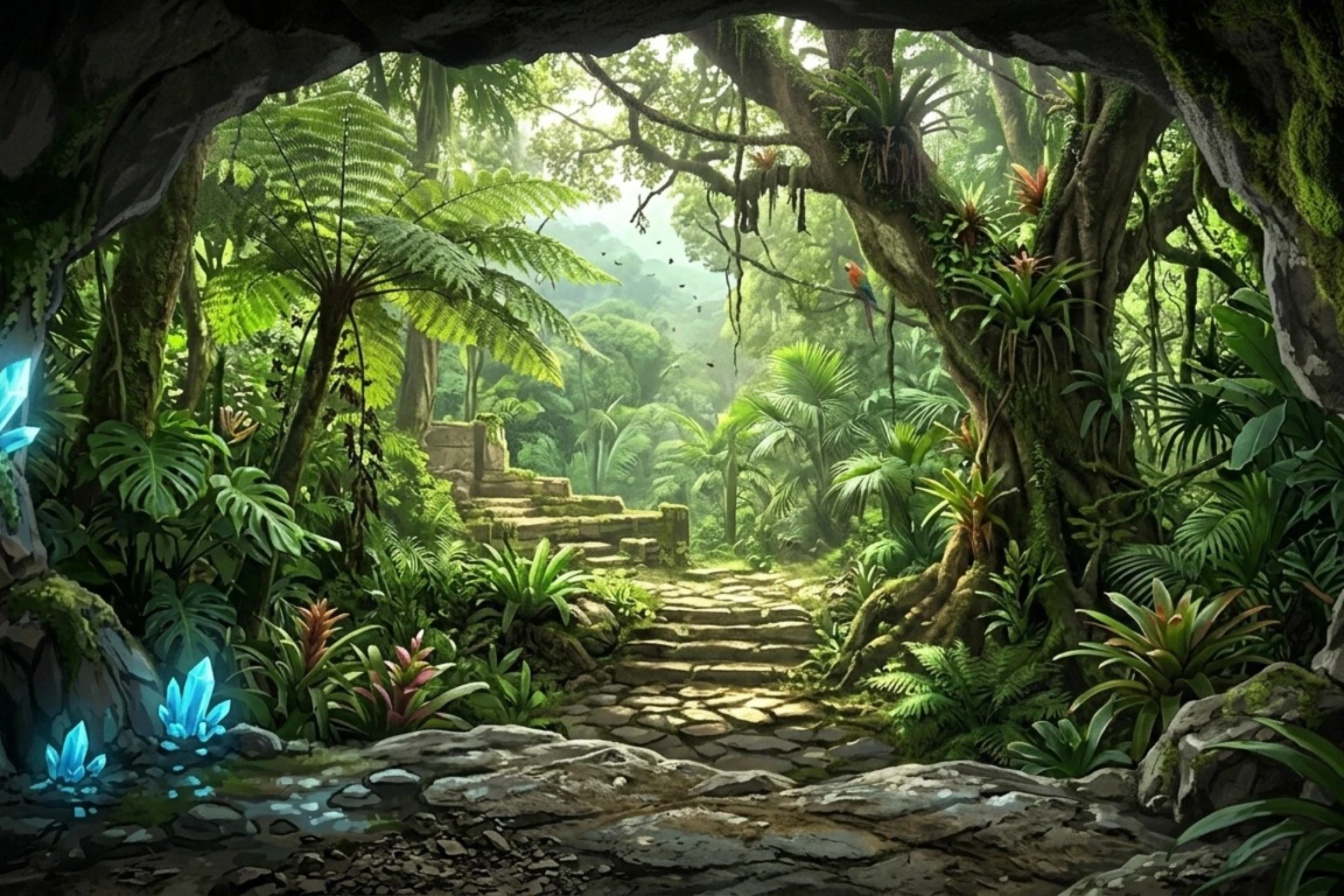 Morning light threaded through the canopy in long, pale beams. Rain from the previous day still clung to leaves and vines, falling in slow drops that landed like soft taps on the forest floor. The air smelled of damp earth and crushed fern. Birds called from far branches, and somewhere deeper in the valley a stream kept its steady, indifferent song.