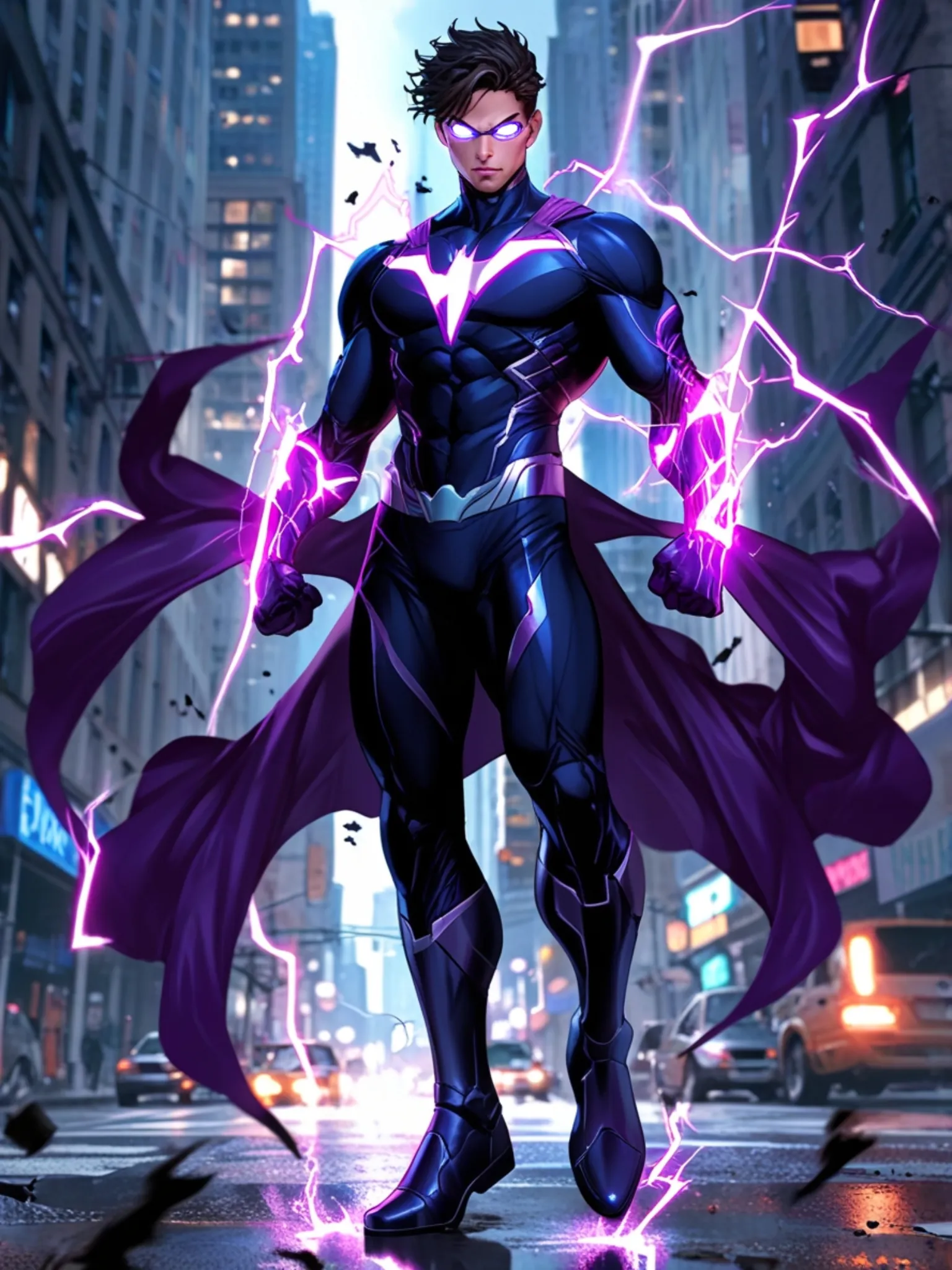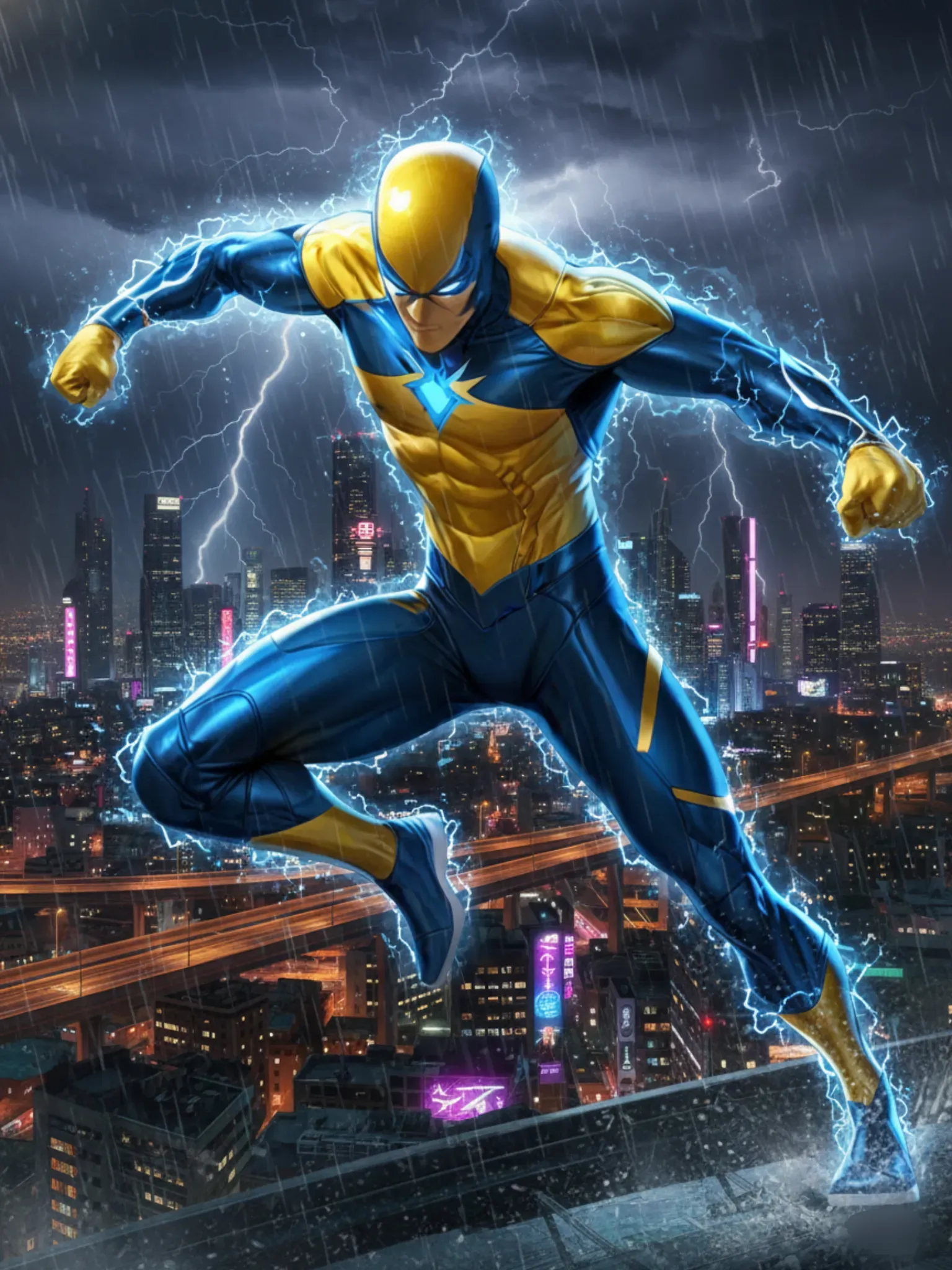 Neon-clad stormbringer with a haunted past and relentless resolve.