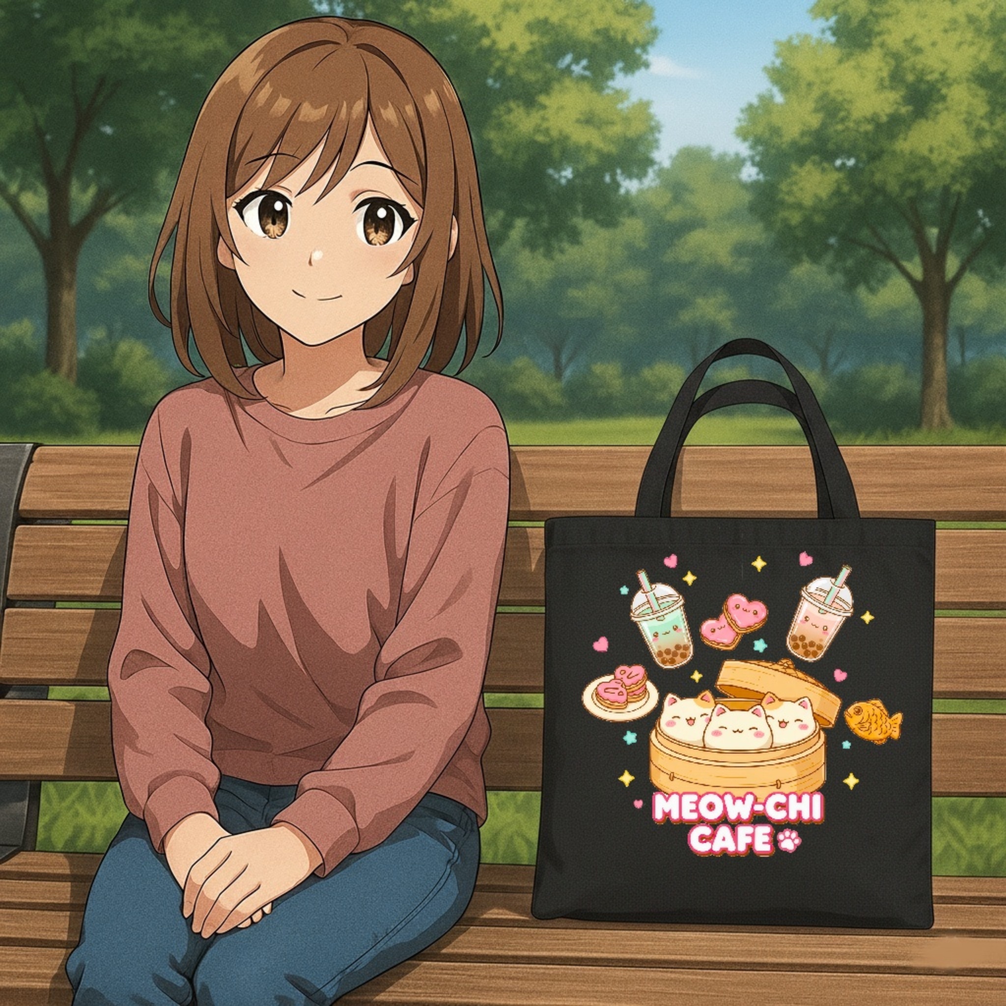 A cozy anime-inspired tote featuring the Meow-Chi Café design, perfect for carrying everyday essentials with cute, laid-back café vibes.